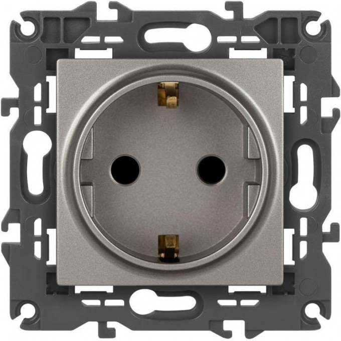 Розетка с заземлением и шторками серии Эра Elegance цвет титан 14-2102-16. Характеристики 16А 250В. Оснащена автоматическими клеммами для надёжной фиксации жил кабеля в механизме. Рамки приобретаются отдельно.